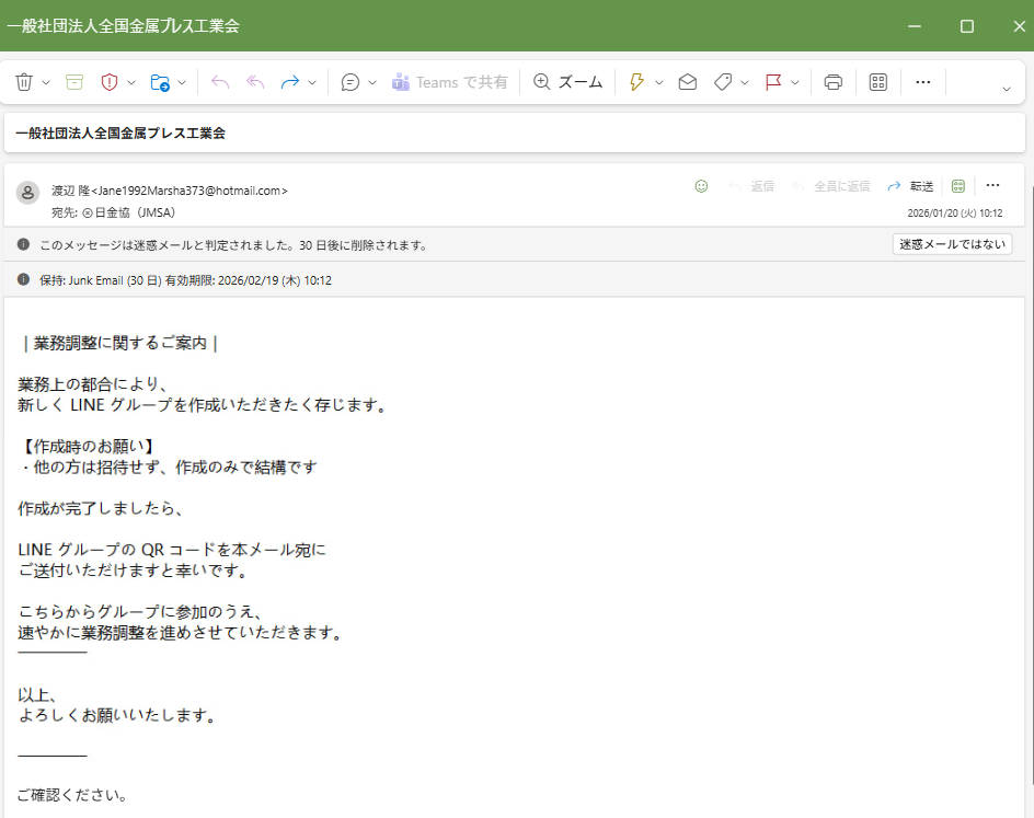 弊協会宛に全国金属プレス工業会の渡辺代表理事を名乗るなりすましメールの事案が発生しました。
